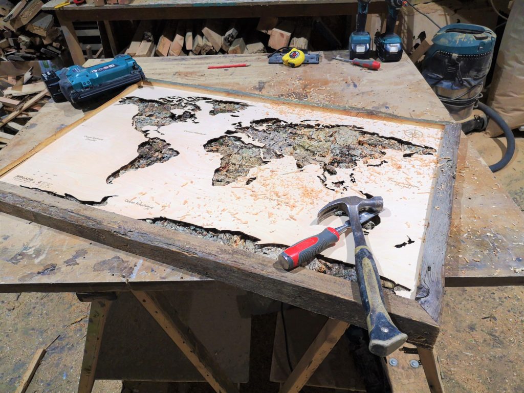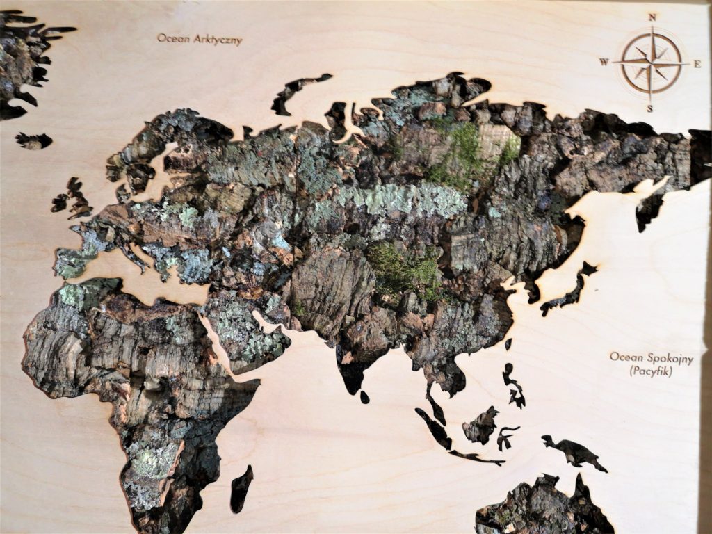 Współpraca pozwoliła na stworzenie połączenia, które przepełnione jest harmonią i kunsztem rzemieślniczym. Wykorzystujemy specjalnie przygotowane topy. Czym są? To drewniany obrys każdego kontynentu i wyspy, a w miejscach, gdzie prześwituje ląd pojawia się on: KOREK. Tworzy wyjątkową strukturę i nadaje niepowtarzalną głębię.
