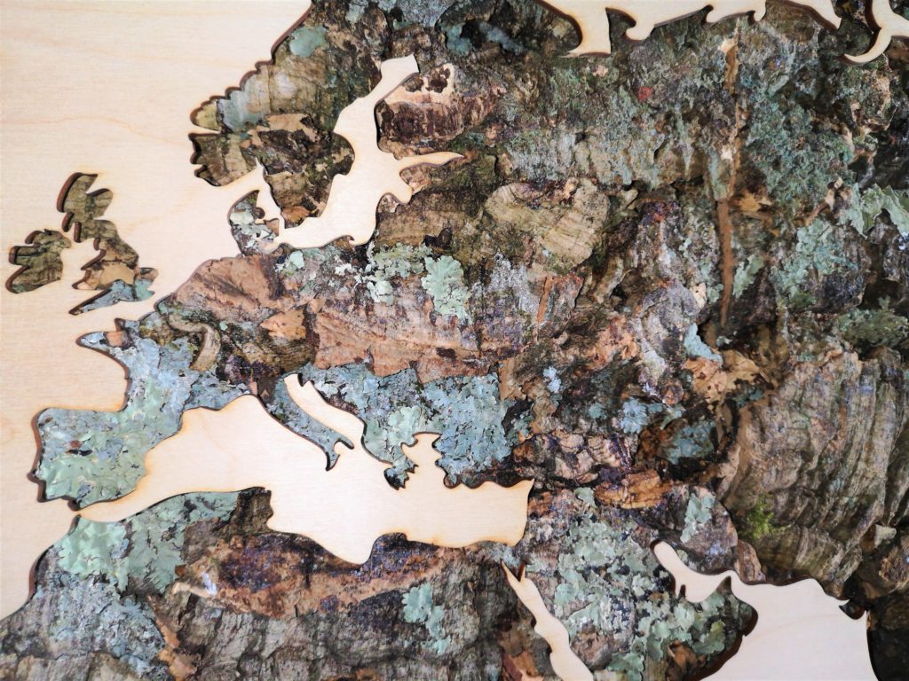 Na samym początku widzieliście zdjęcie kory z rysami Mapy. Kora jak kora? Nie do końca. Używamy tu kory z Dębu korkowego. Dociera do nas prosto ze słonecznej Portugalii.