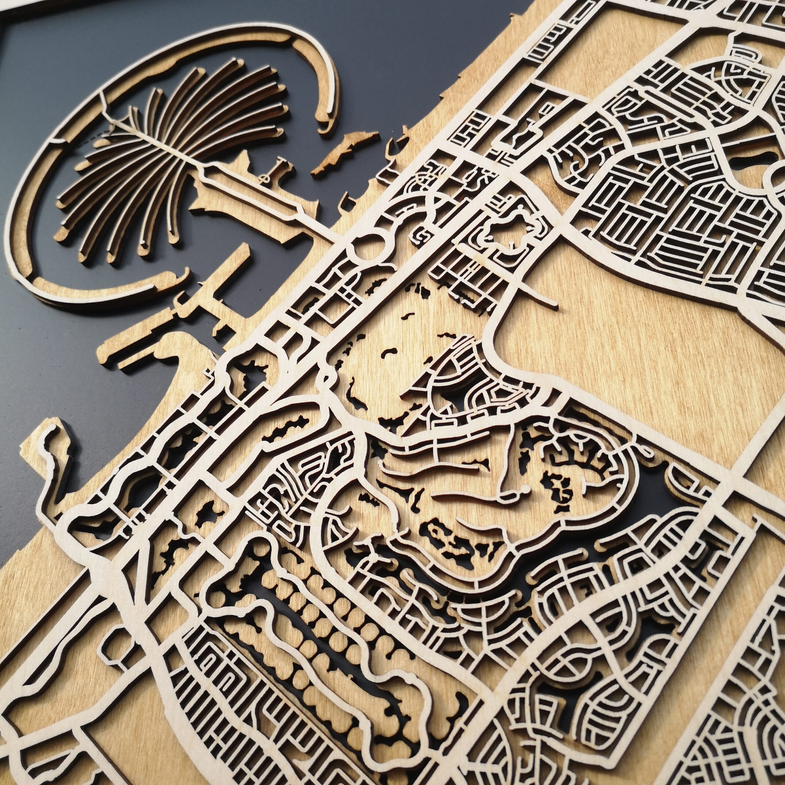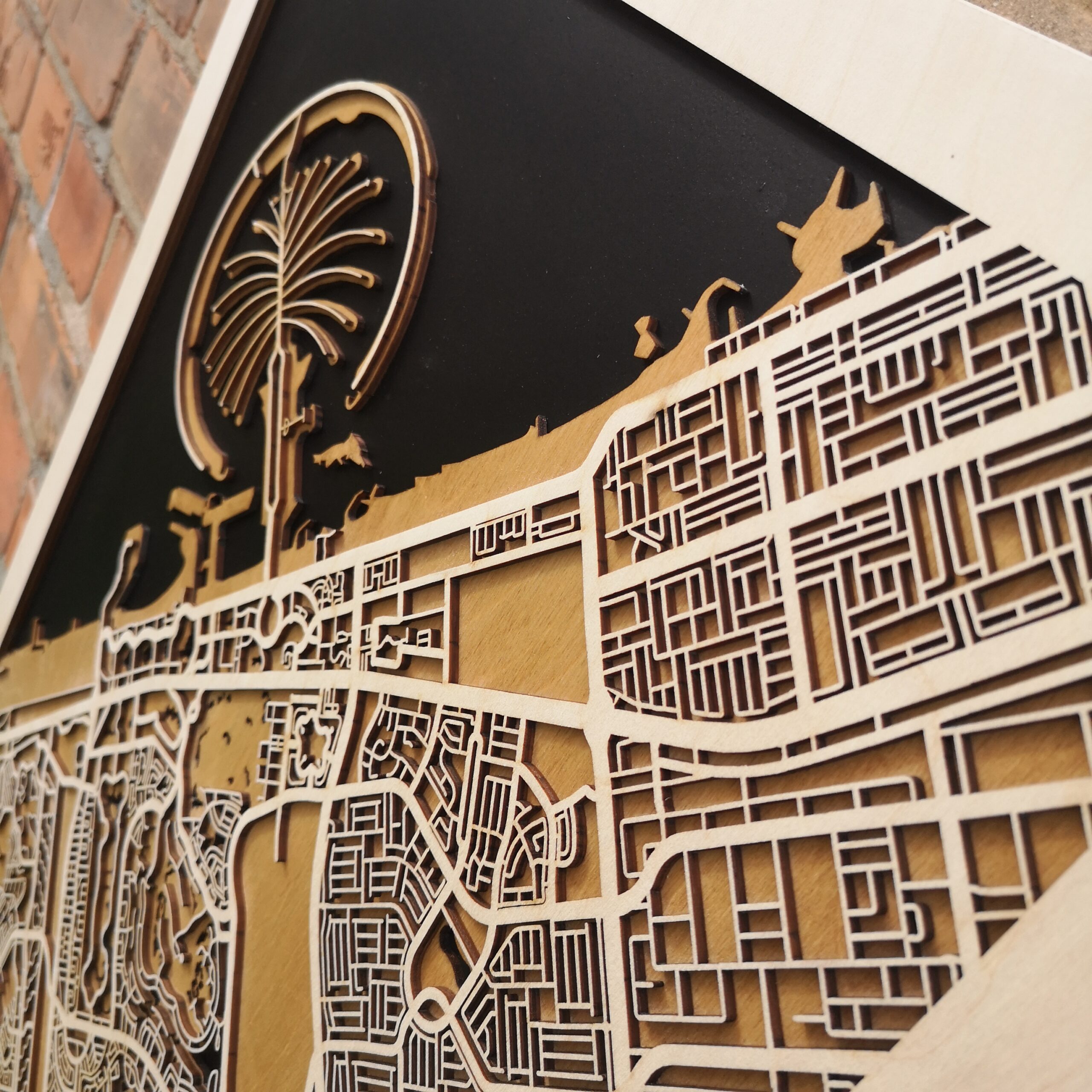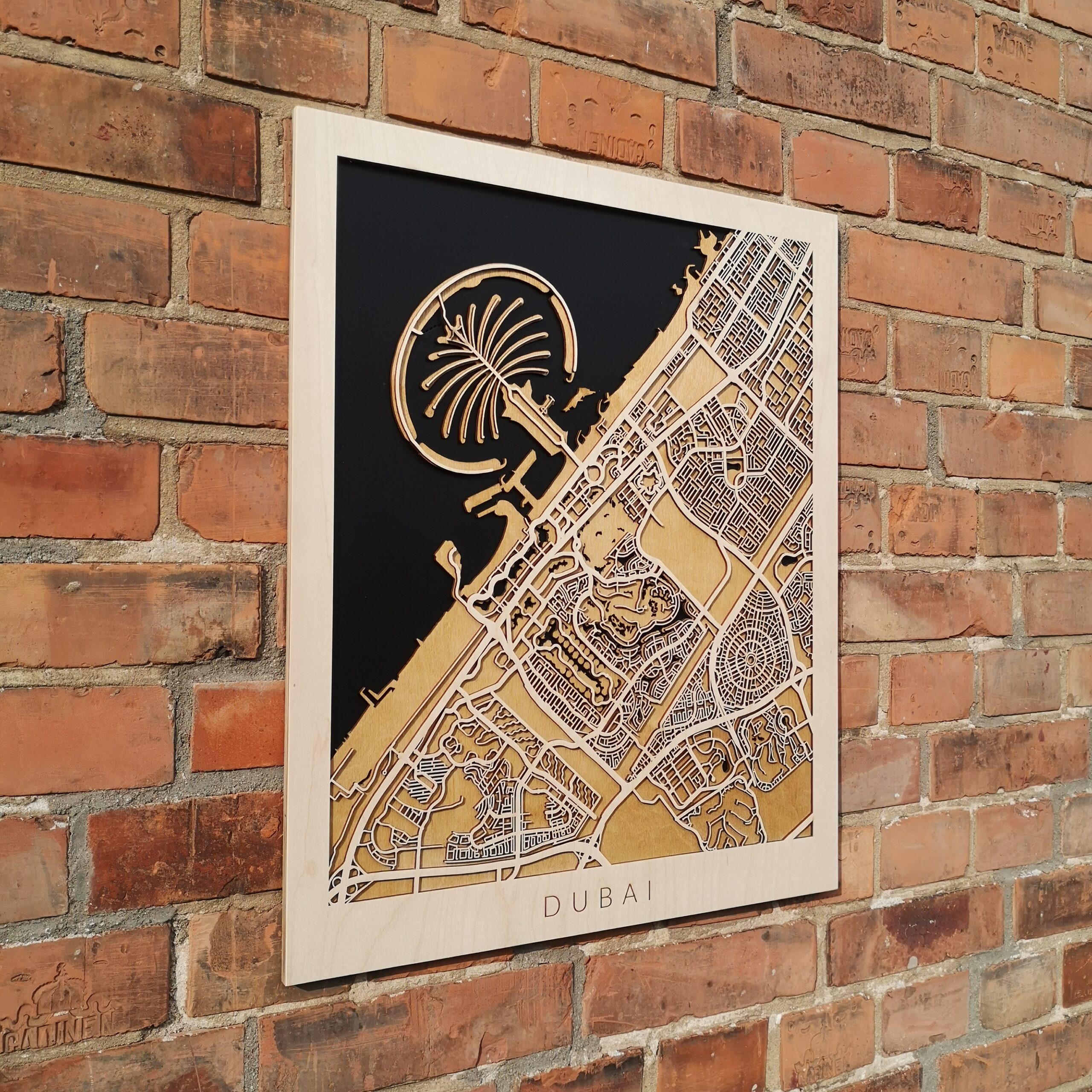 Drewniany Plakat Miejski – Dubai – w ciemnej wersji kolorystycznej zachwyca i inspiruje.