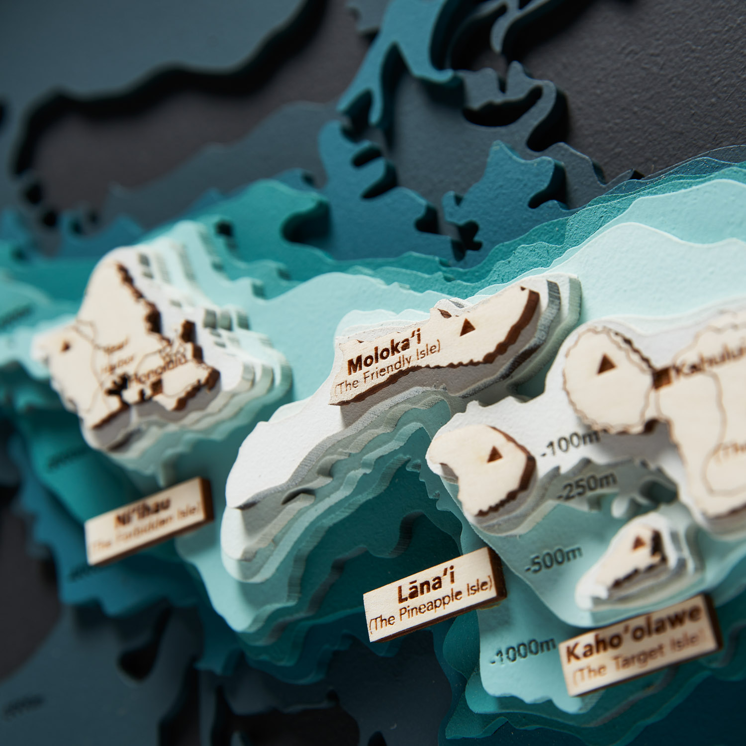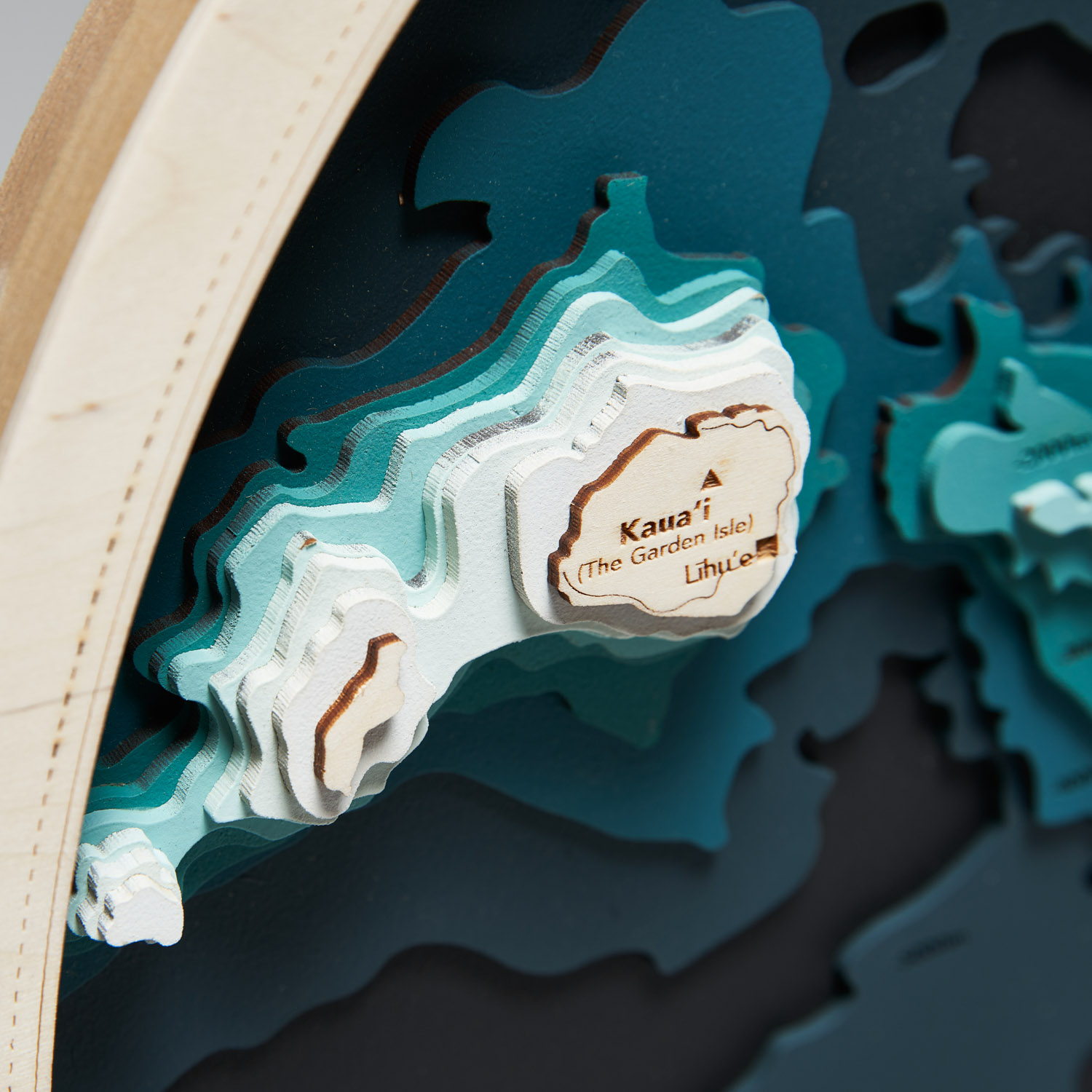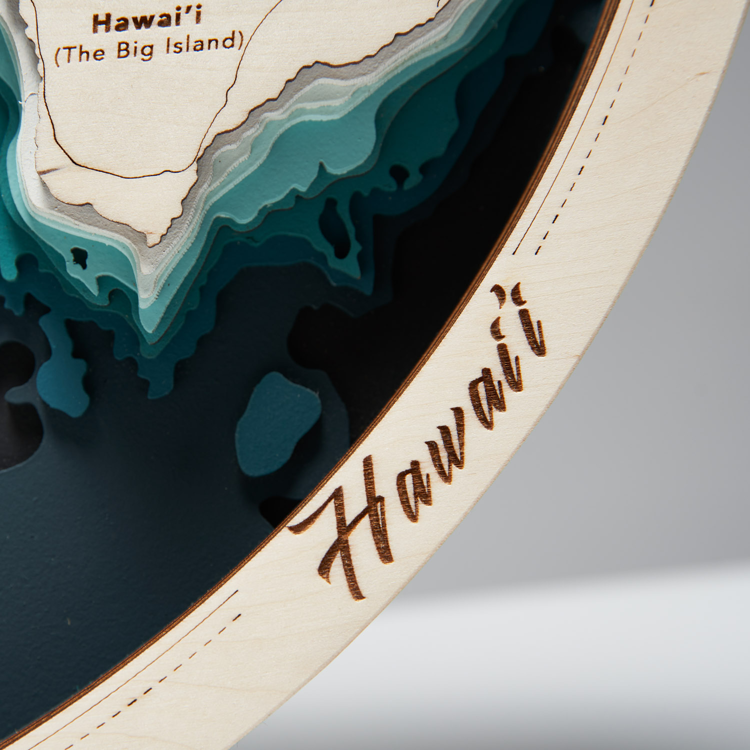 Odkryj niesamowite wyspy, szczyty wulkanów i otaczające wody Pacyfiku dzięki naszej Batymetrycznej Mapie Topograficznej Hawajów, ręcznie polerowanej, klejonej z 10 warstw drewnianej sklejki. Okrągły kształt sprawia, że wspaniale zaprezentuje się w  sypialni lub salonie, jako obraz do powieszenia nad kanapą, najlepiej w towarzystwie innych Map Wysp. Turkus, który kontrastuje z delikatnym beżem sklejki drewnianej potęguje jej wyrazistość i wrażenie faktycznej głębi. Z tyłu znajduje się otwór do zawieszenia.