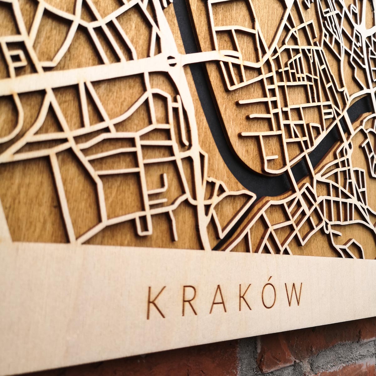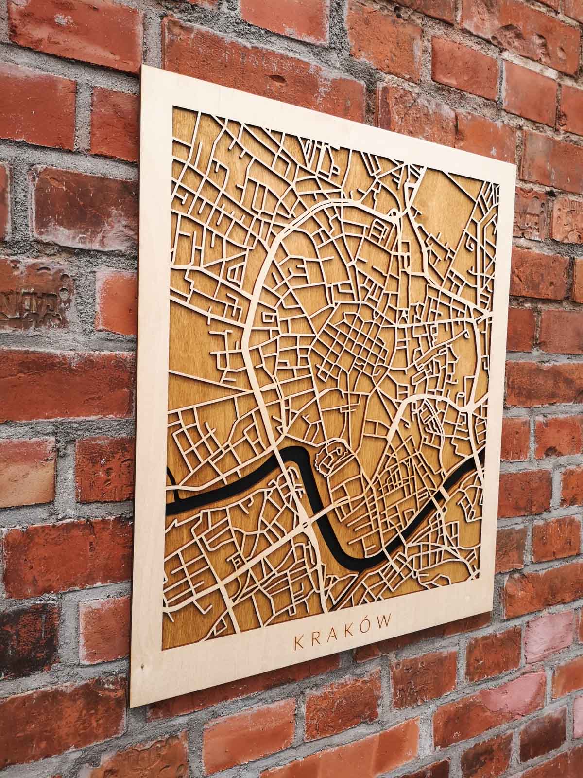Drewniany Plakat Miejski – Kraków – w ciemnej wersji kolorystycznej zachwyca i inspiruje.