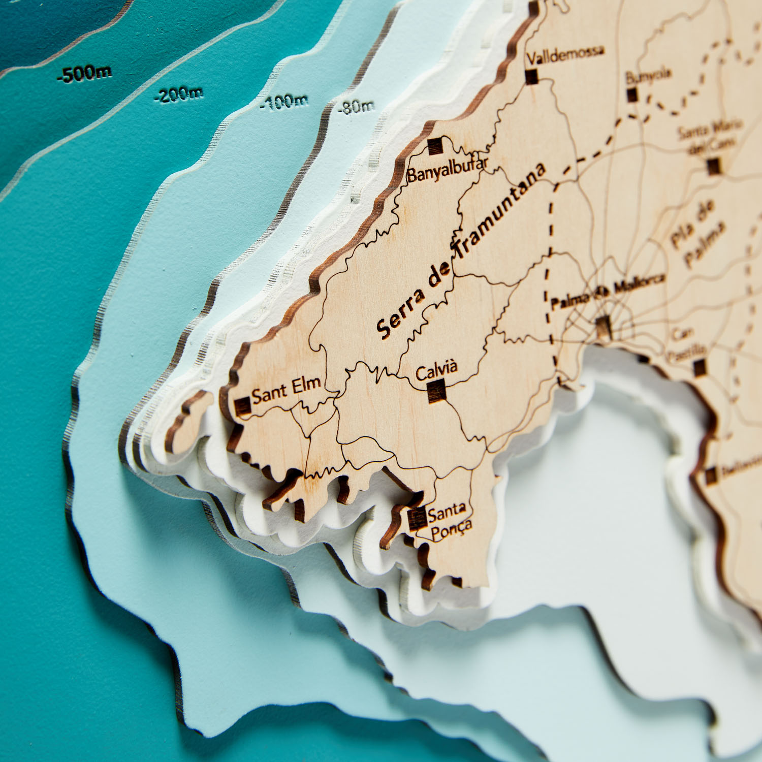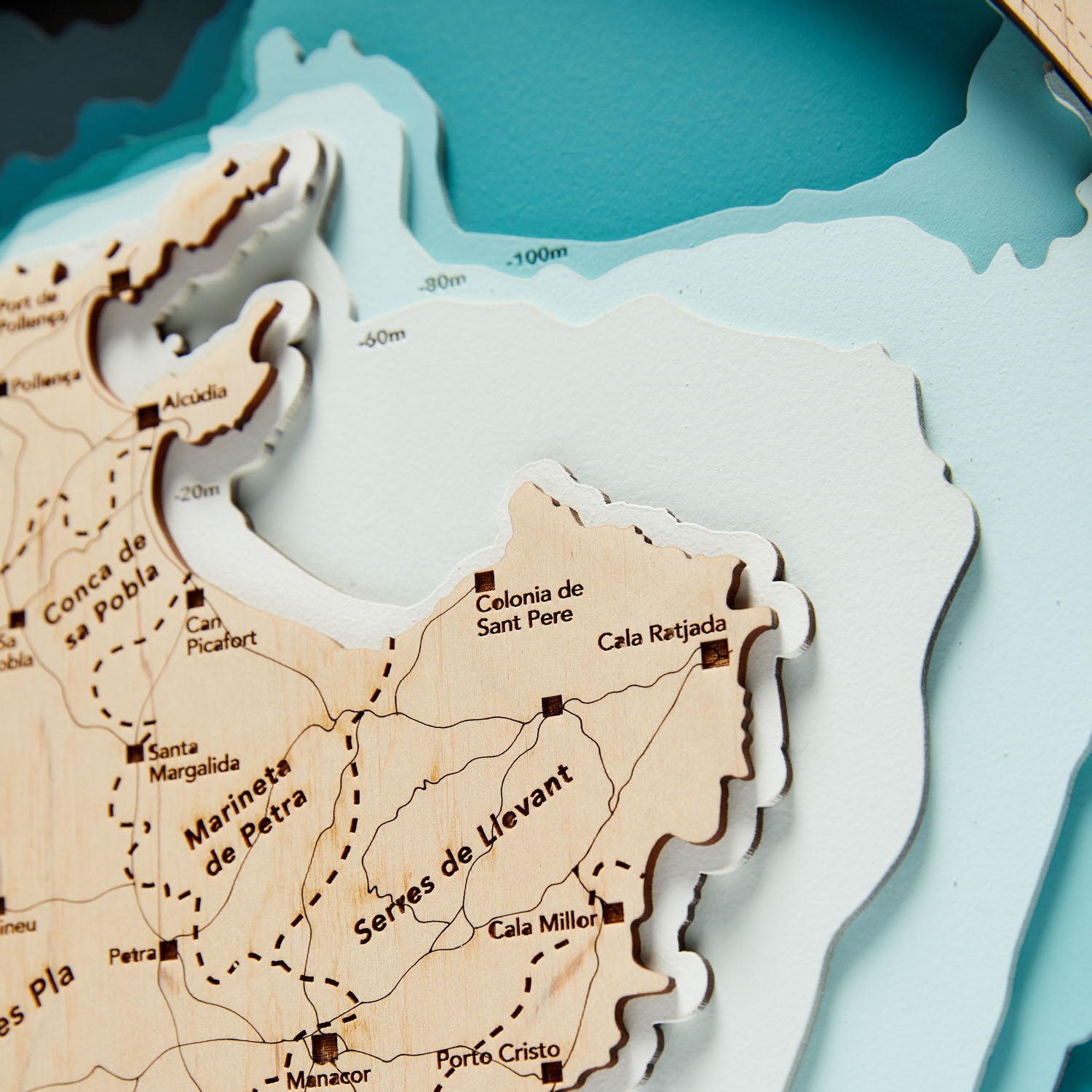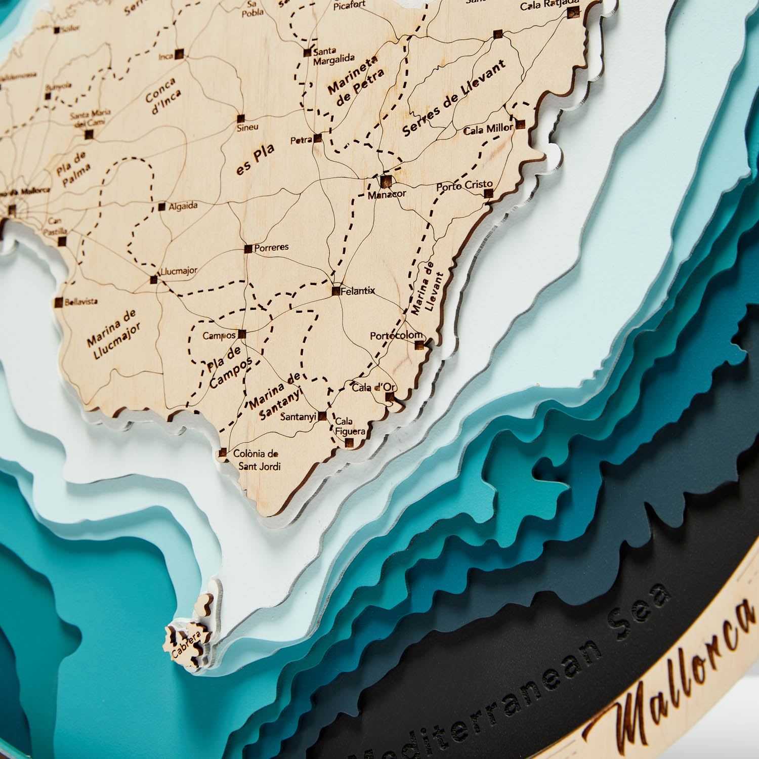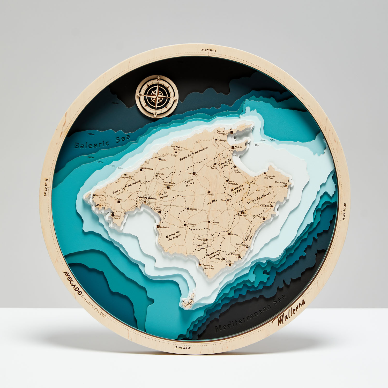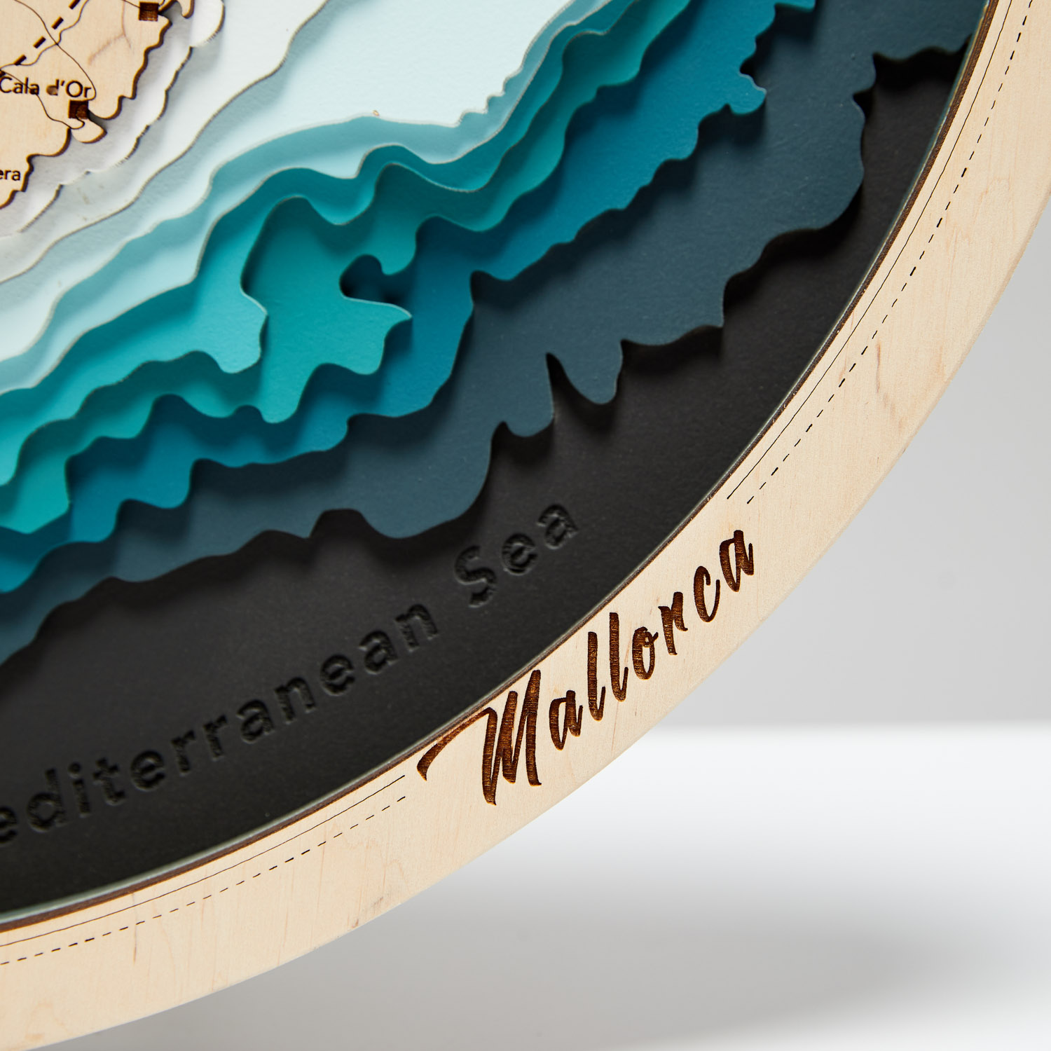 Drewniana okrągła mapa Majorki dostępna w języku angielskim