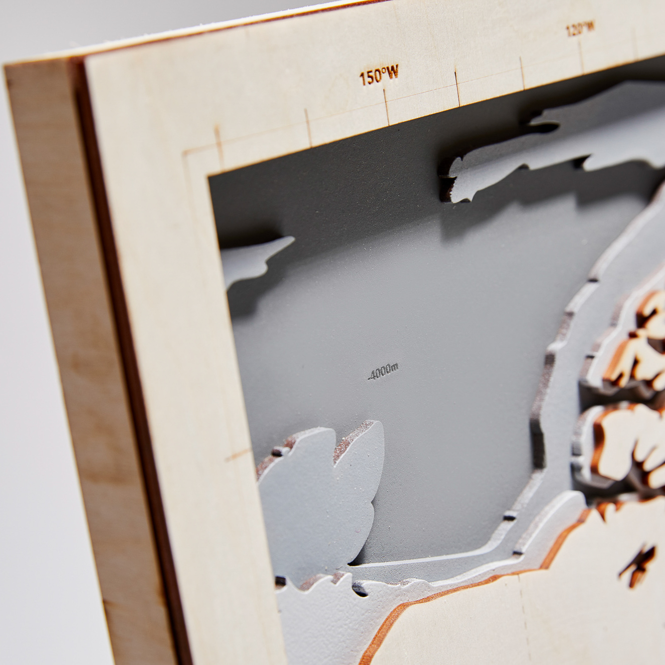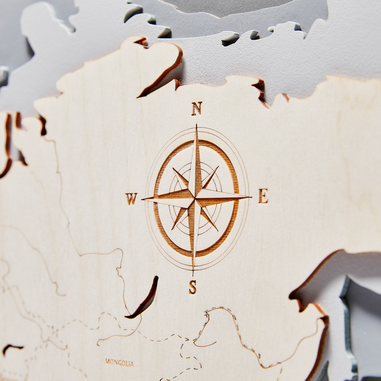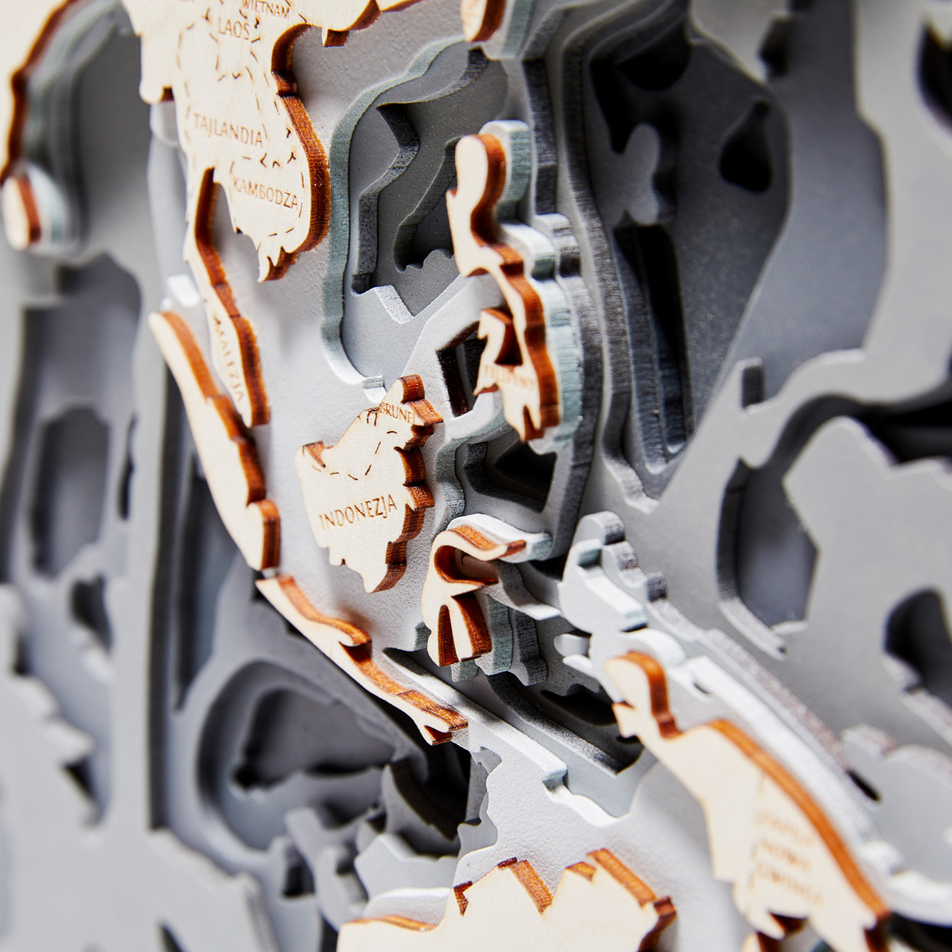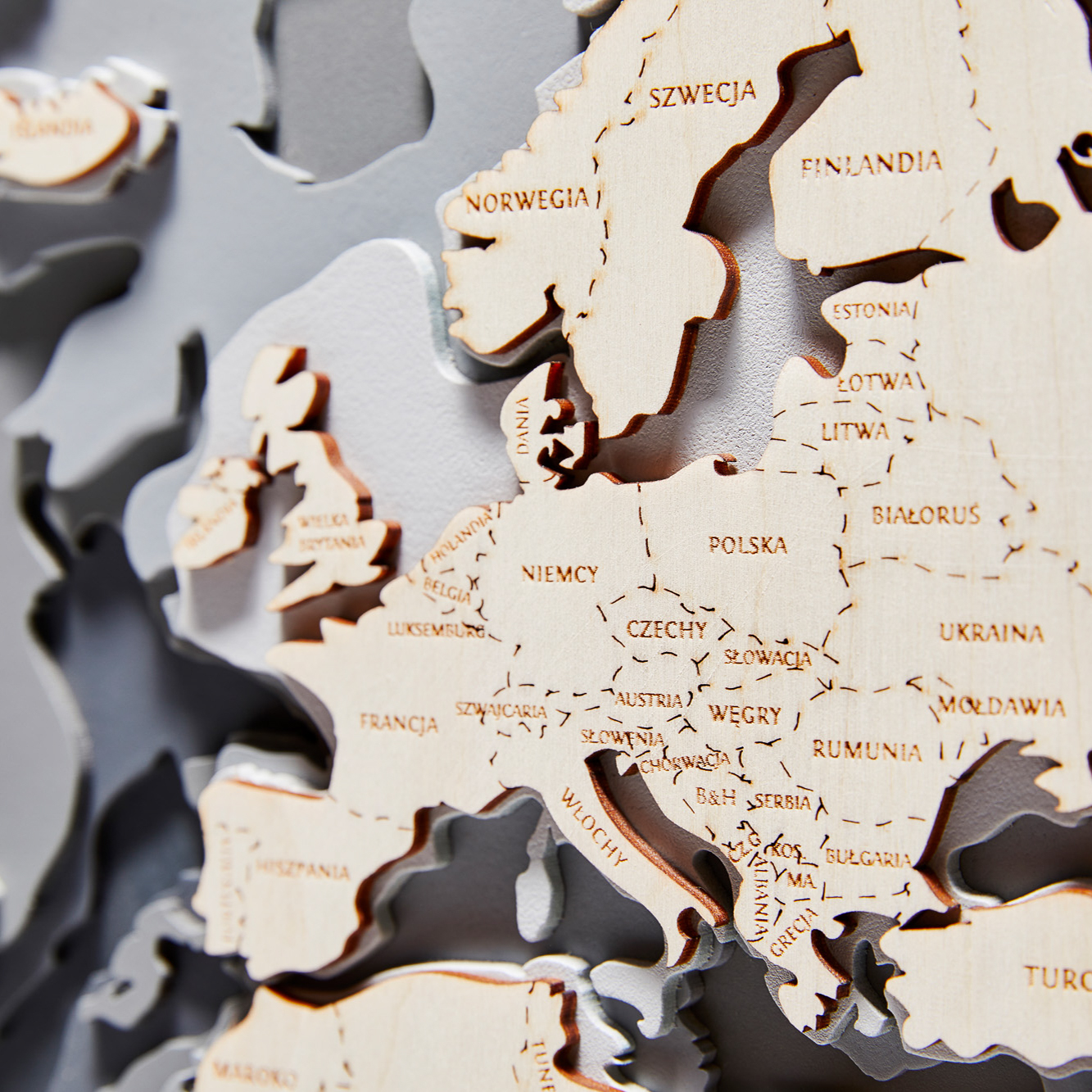 Nasza Mapa Świata Drewniana łączy w sobie walory estetyczne i funkcjonalne. Entuzjasta dalekich podróży może spędzić długie godziny na wędrowaniu palcem po jej trójwymiarowej strukturze i rozmyślaniu o kolejnych eskapadach. Stylowy kontrast między szarą kolorystyką wód, a jasnym odcieniem drewna obrazującym lądy wpływa na to, że nasza mapa drewniana na ścianę trafi w gust nawet najbardziej wymagającego estety.