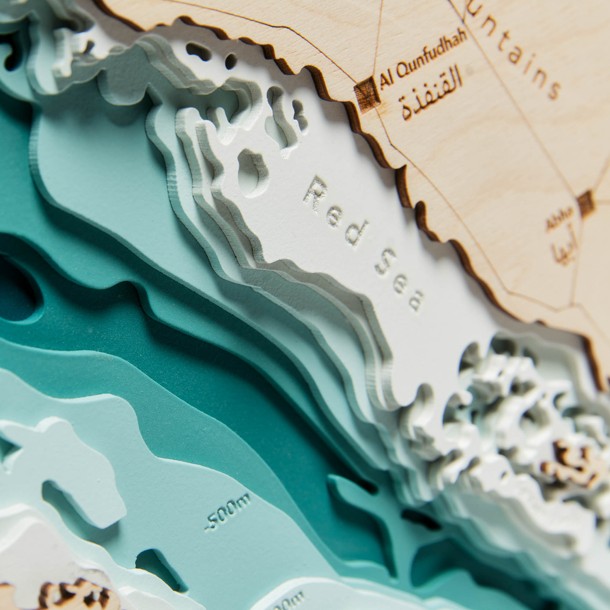 Turkus, który kontrastuje z delikatnym beżem sklejki drewnianej potęguje jej wyrazistość i wrażenie faktycznej głębi.