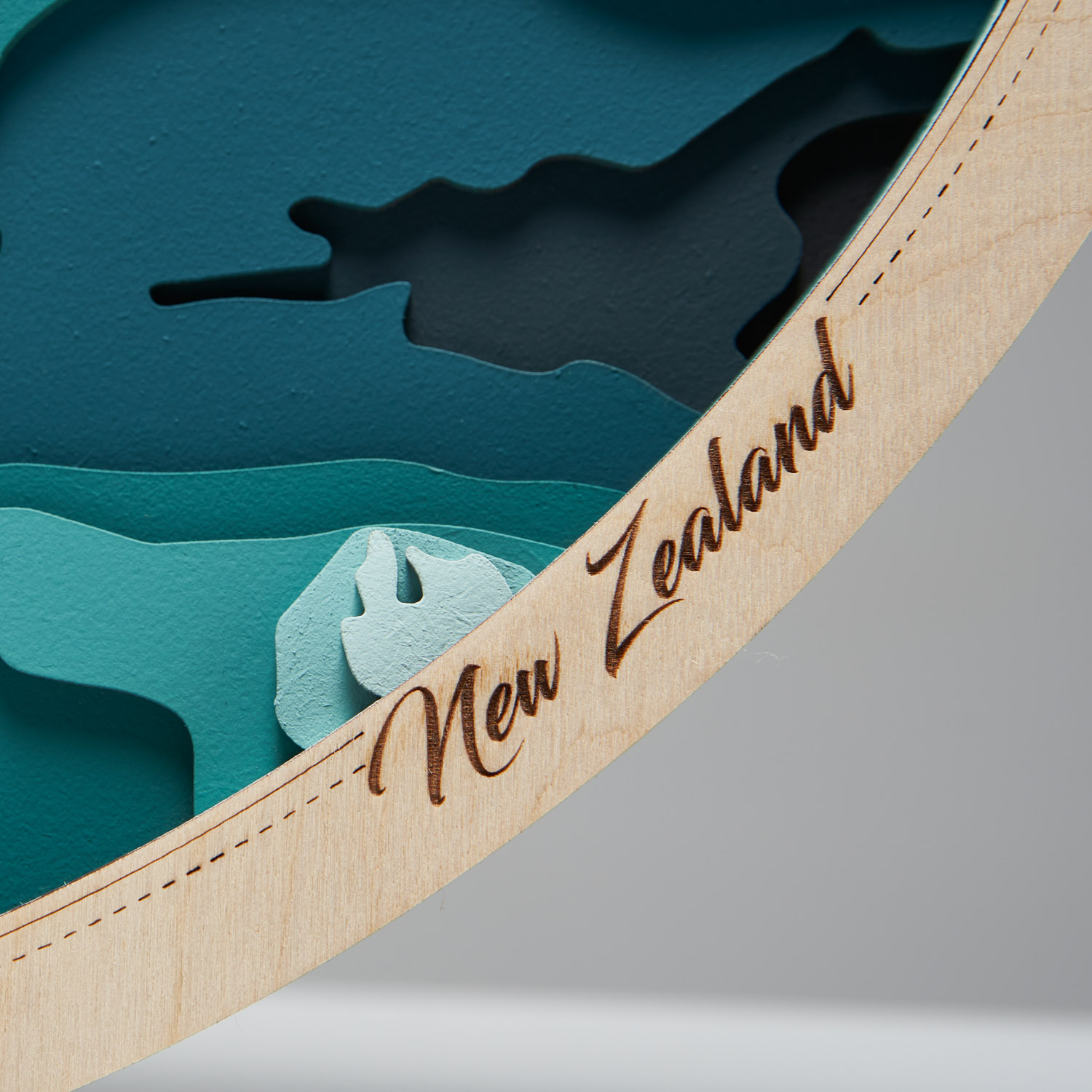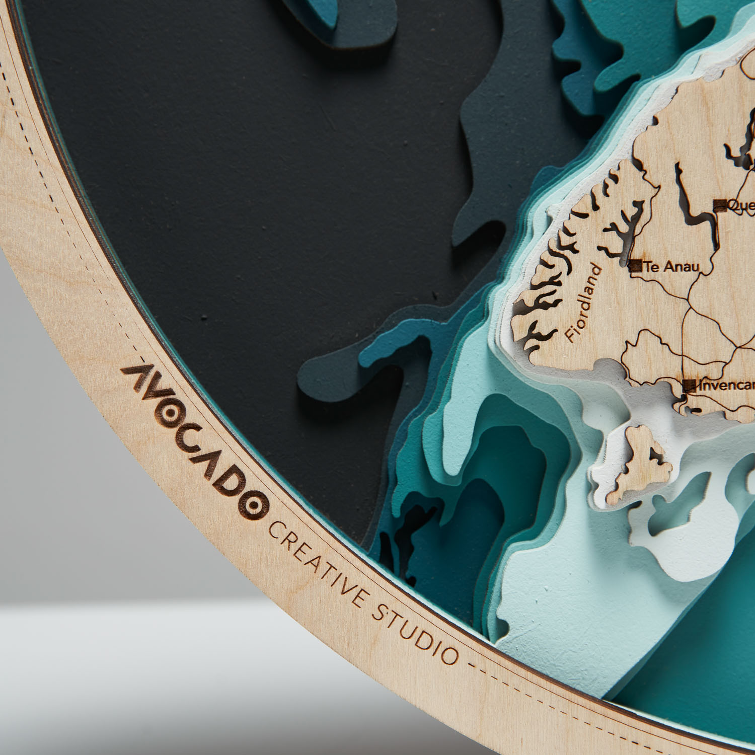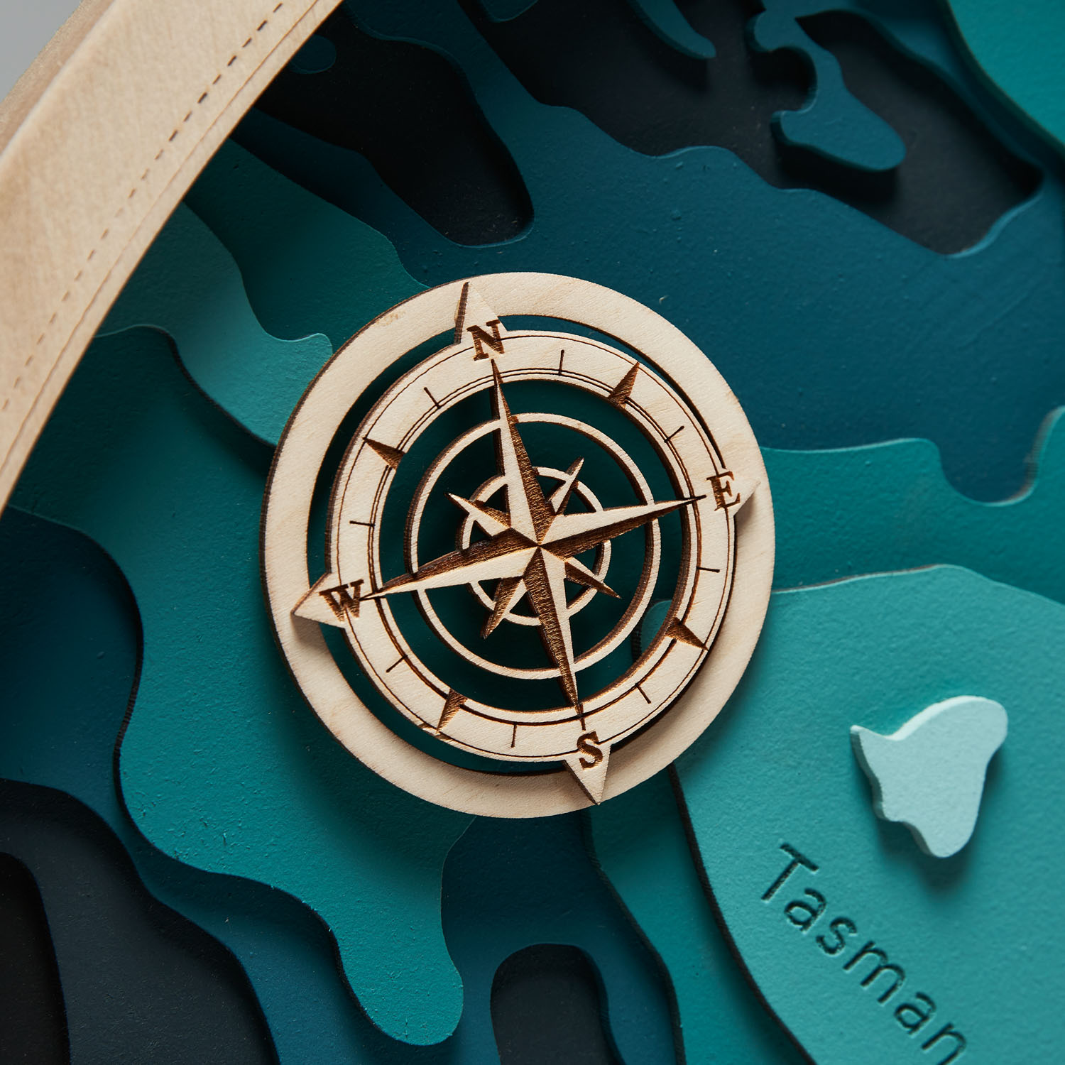 Okrągły kształt sprawia, że wspaniale zaprezentuje się w  sypialni lub salonie, jako obraz powieszony nad kanapą, najlepiej w towarzystwie innych Map Wysp. Turkus, który kontrastuje z delikatnym beżem sklejki drewnianej potęguje jej wyrazistość i wrażenie faktycznej głębi. Jest ręcznie polerowana, malowana i klejona z 10 warstw drewnianej sklejki oraz posiada otwór do zawieszenia.