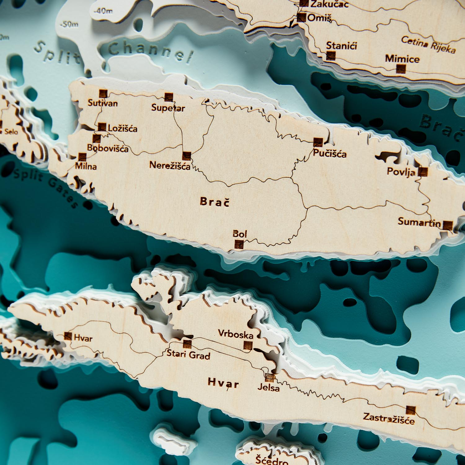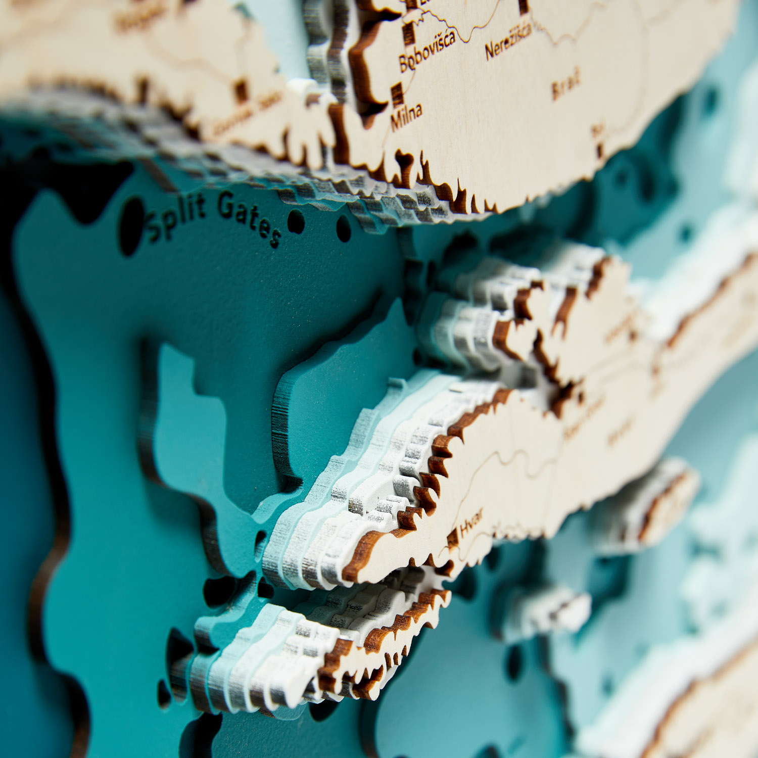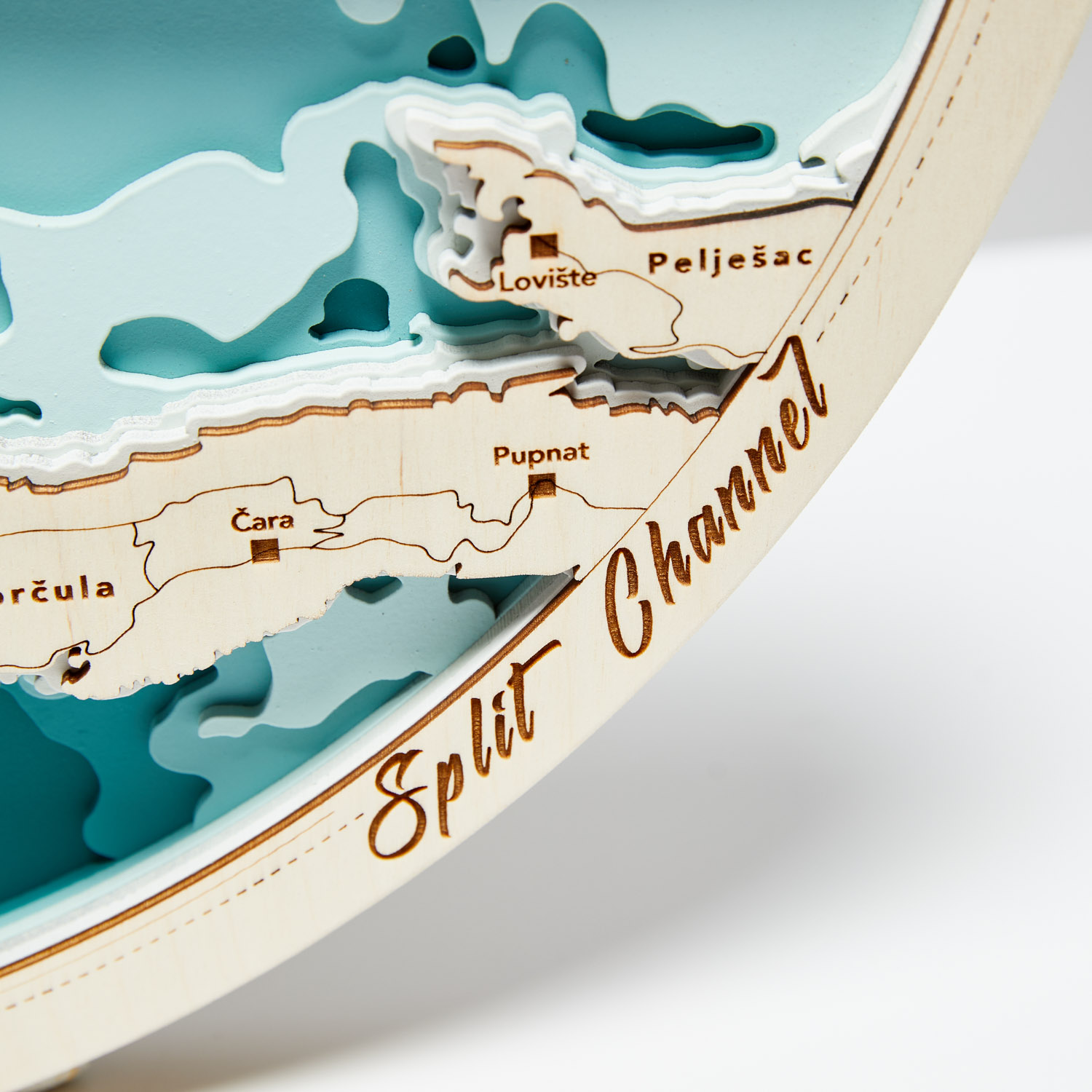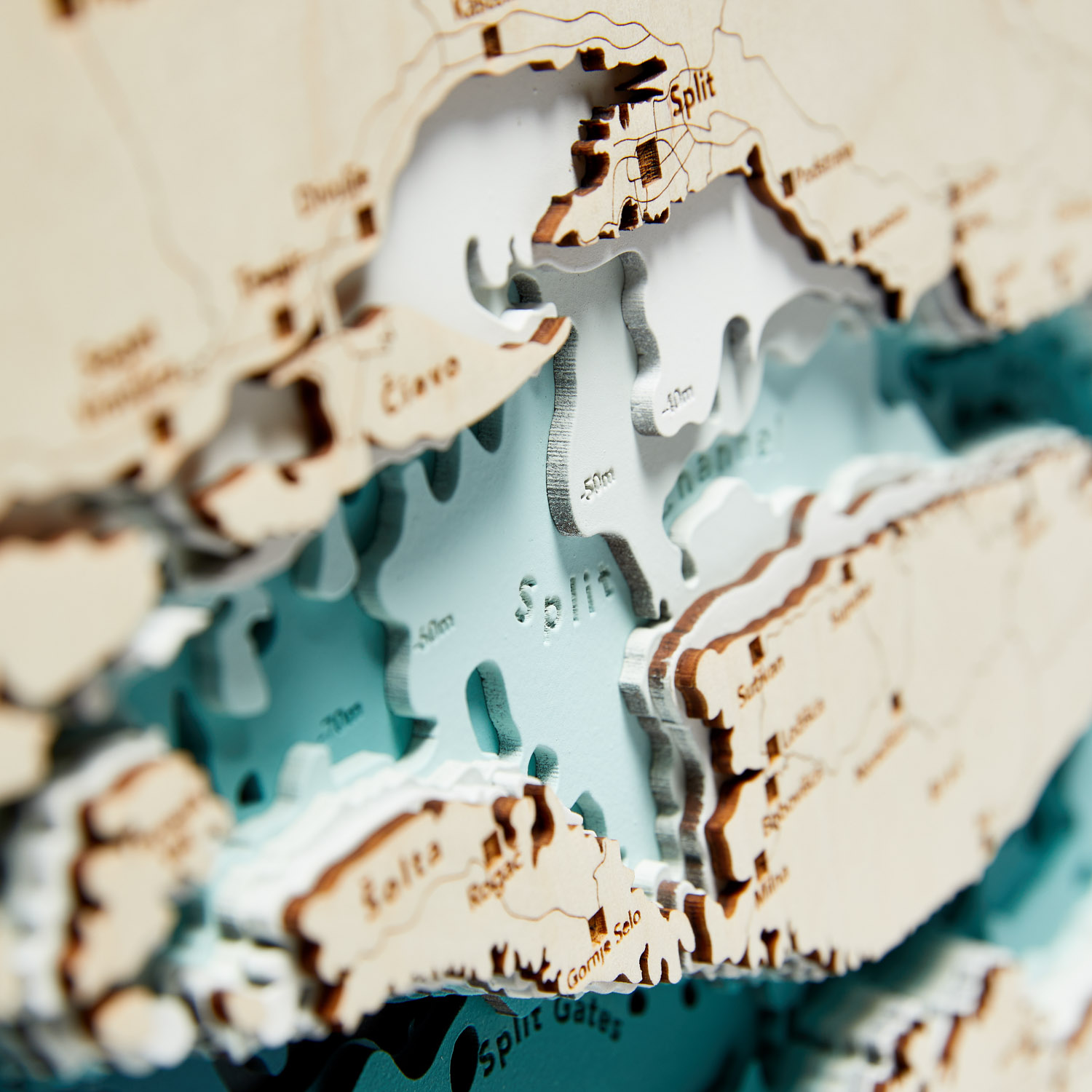 Odkryj Zatokę Split i okoliczne wyspy dzięki naszej Mapie, ręcznie polerowanej, klejonej z 10 warstw drewnianej sklejki. Okrągły kształt sprawia, że wspaniale zaprezentuje się w  sypialni lub salonie, powieszonia nad kanapą, najlepiej w towarzystwie innych Map Wysp. Turkus, który kontrastuje z delikatnym beżem sklejki drewnianej potęguje jej wyrazistość i wrażenie faktycznej głębi. Z tyłu znajduje się otwór do zawieszenia.