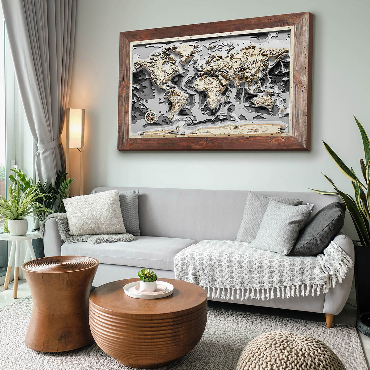 Świat Gór i Oceanów – Drewniana Mapa w ramie (szara)
