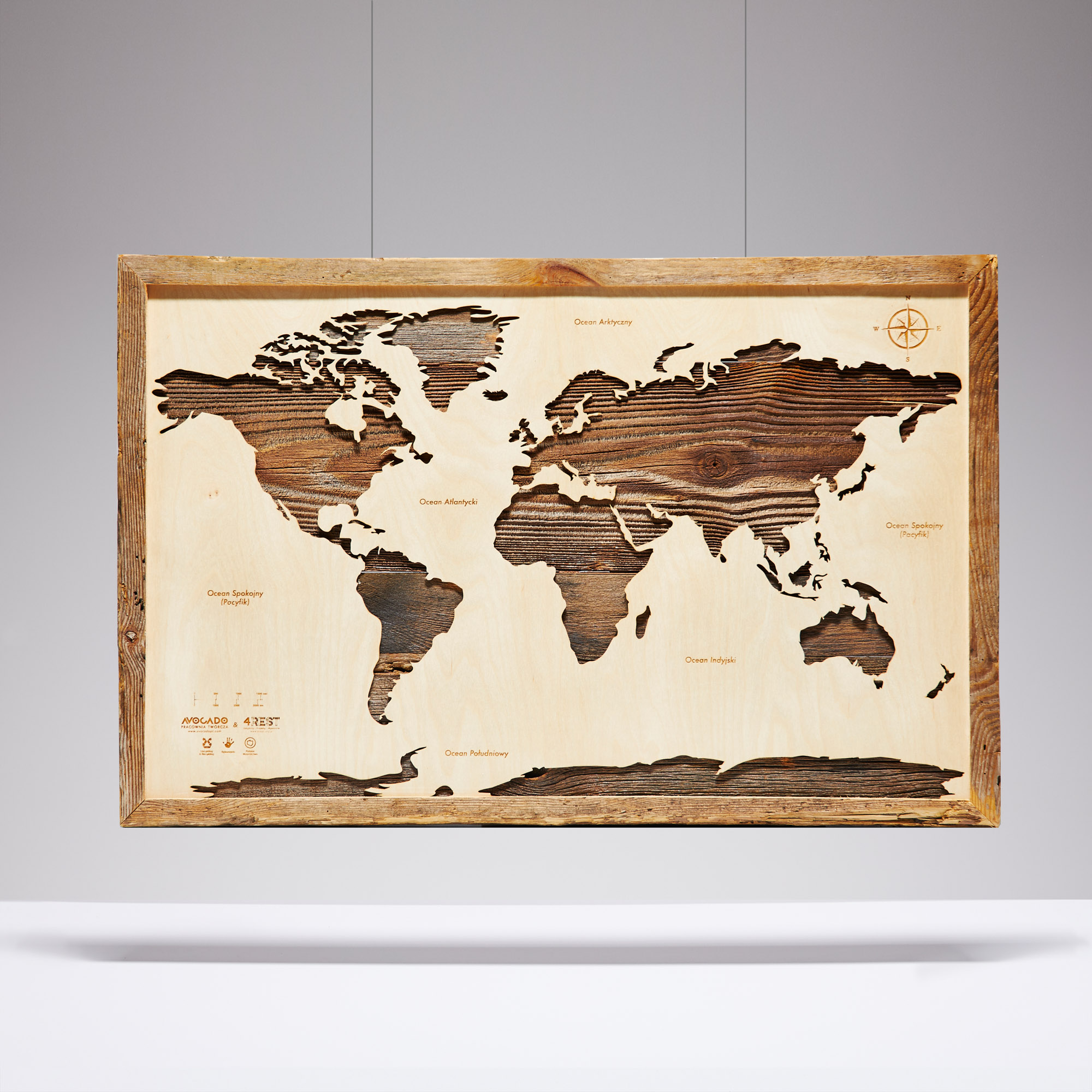 Drewniana mapa świata to subtelne połączenie naturalnego, odzyskanego drewna, które ma swoją własną historię oraz nowoczesnej, popularnej sklejki. To mapa ręcznie polerowana i klejona. Ma duszę, którą zawdzięcza upcyklingowi. Łatwa do zawieszenia jest idealną ozdobą do mniejszych, jak i większych pomieszczeń. Naturalne zestawienie kolorów sprawia, że mapa dopasuje się do każdej ściany, a jej zapach jeszcze długo będzie się unosił we wnętrzu.