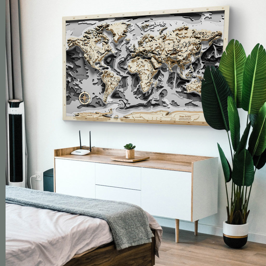 Styl eko w mieszkaniu jest bardzo uniwersalny, jednak można mu nadać bardziej spersonalizowanego charakteru. Jeżeli jesteś miłośnikiem podróży i poznawania nowych miejsc, to świetnym dodatkiem uzupełniającym wystrój okaże się mapa drewniana od Avocado Pracowni Twórczej. Oferujemy ręcznie robione, unikalne mapy, które w oryginalny sposób przedstawiają różne zakątki naszej planety. Osoby zainteresowane naszymi produktami mogą zamówić m.in. Mapy Morskie Świata, Mapy Morskie Europy, Mapy Gór czy mapy przedstawiające ich ulubione miasto. Kupisz u nas zarówno mapy naścienne, jak i do postawienia na regale, dzięki czemu masz szansę wybrać opcję lepiej wpasowującą się w koncepcję aranżacyjną Twojego pomieszczenia. Z mapą jako blat i z drewna z odzysku możemy stworzyć dla Ciebie wyjątkowy stolik do eko wnętrza.